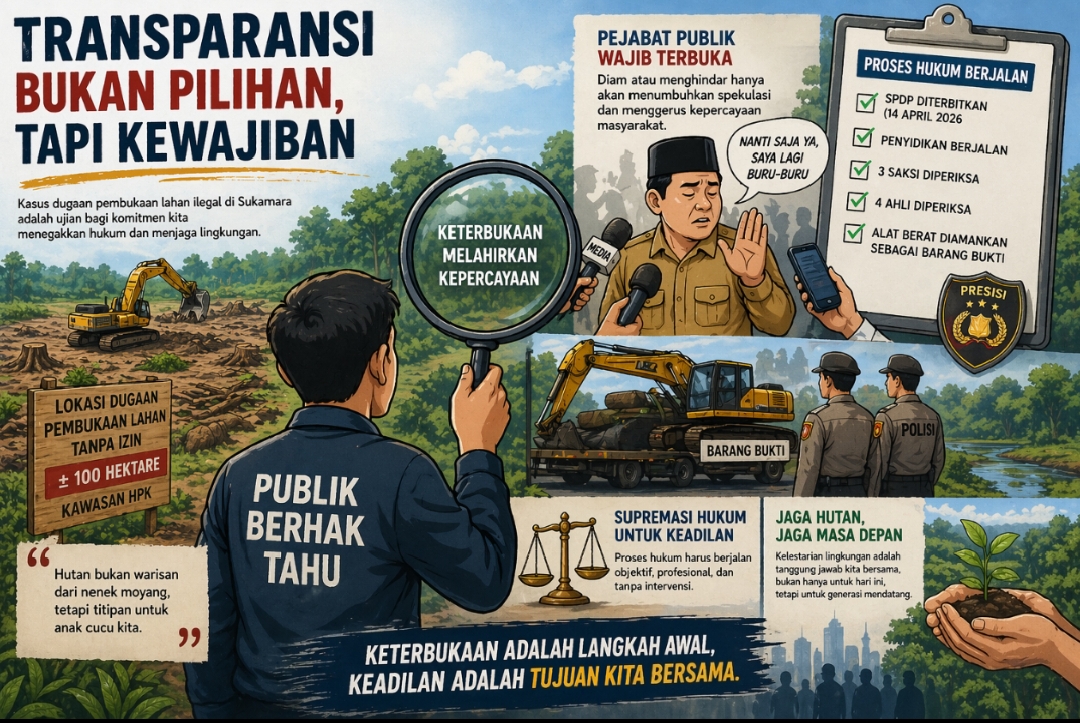OPINI — Kasus dugaan pembukaan lahan tanpa izin di kawasan Hutan Produksi yang dapat Dikonversi (HPK) di Kabupaten Sukamara kembali mengingatkan kita pada persoalan klasik: lemahnya transparansi dalam pengelolaan sumber daya alam. Ketika proses hukum mulai berjalan dan perhatian publik meningkat, justru kejelasan informasi dari pihak-pihak terkait masih terasa minim.