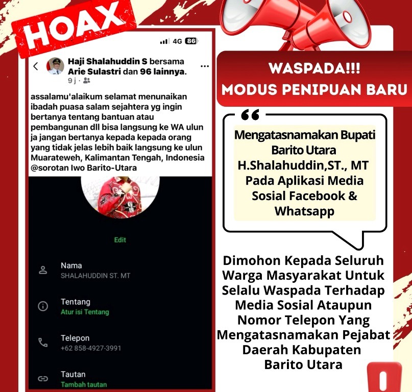 Muara Teweh – Pemerintah Kabupaten Barito Utara melalui Dinas Komunikasi, Informatika dan Persandian (Diskominfosandi) mengimbau masyarakat untuk meningkatkan kewaspadaan terhadap modus penipuan yang mengatasnamakan Bupati Barito Utara H. Shalahuddin, ST., MT melalui media sosial maupun aplikasi pesan singkat.
